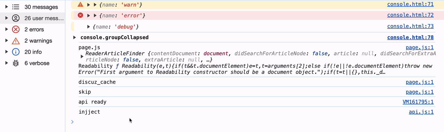 在 Firefox 和 Safari 浏览器中,Web 控制台的日志中的项目旁边会显示一个小的I图标, 在 Chrome 浏览器中 console.info 和 console.log 输出格式并无什么不同