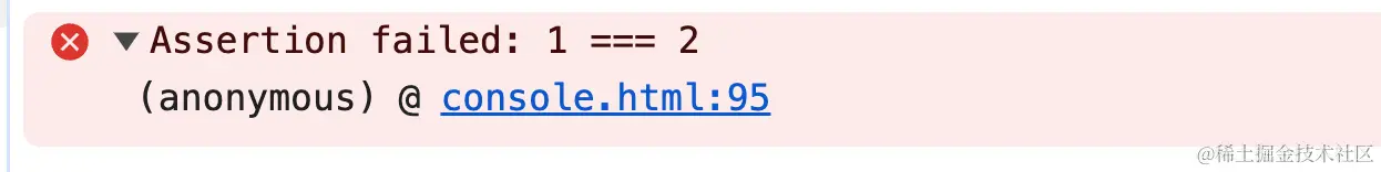 console.assert() 用于在特定条件不满足时输出错误信息到开发者工具的控制台。它接受一个表达式作为第一个参数,如果该表达式的值为 false,则会将第二个参数作为错误信息输出到控制台中。
