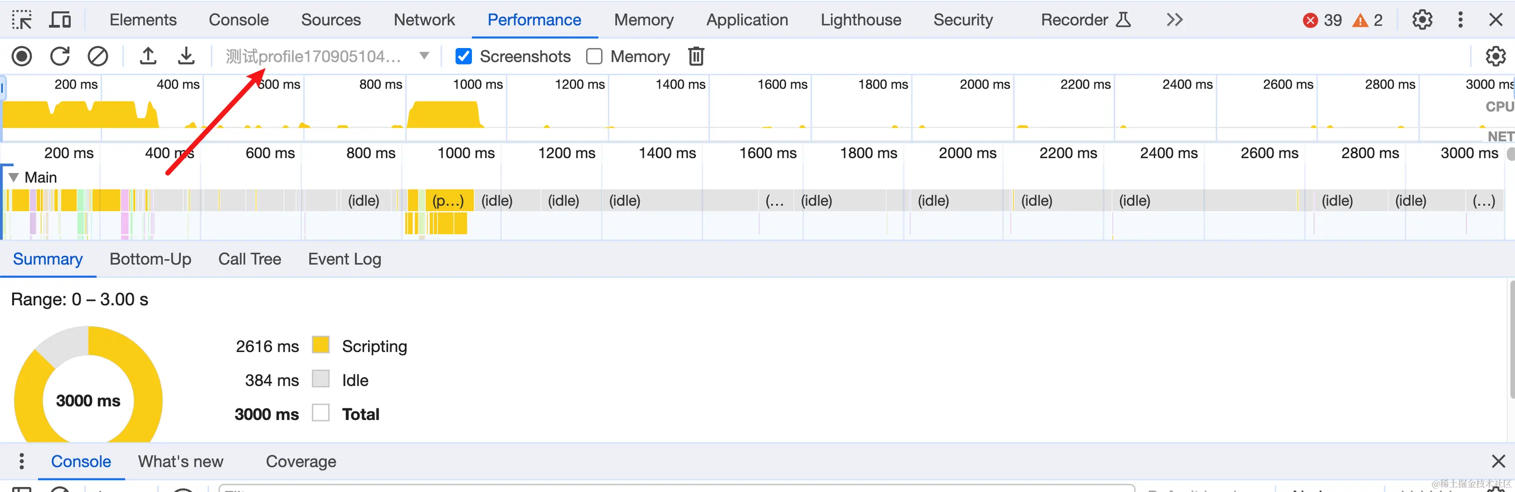console.profile()可以接受一个参数作为 命名描述信息 , 这样在调用多个console.profile()的时候可以进行区分,同时console.profileEnd也可以通过 命名描述信息 去关闭指定的console.profile()