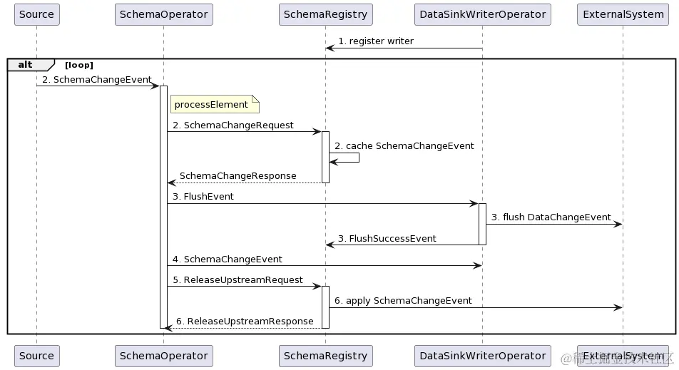 - SchemaRegistry 接收到 FlushSuccessEvent 以后,会和第 1 步中注册的 Sink Operator 进行比较,如果所有的 Sink Operator 都已刷写完毕,则开始将第 2 步中受到的 SchemaChangeEvent 应用到外部系统中,并且对第 4 步接收到的 ReleaseUpstreamRequest 进行回应。这样,SchemaOperator 就可以开始继续传递新的数据变更时和表结构变更事件了。
