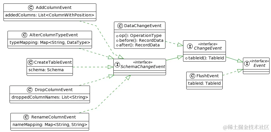 ChangeEvent 接口代表着在一张表上发生过的变更事件,实现类包括数据变更事件(即 DataChangeEvent 类)和表结构变更事件(即继承 SchemaChangeEvent 接口的类)两种:DataChangeEvent 里保存了完整的数据变更信息,即包含了变更前(before)和变更后(after)每条记录的字段值;SchemaChangeEvent 有增加列、删除列、修改列类型等实现。