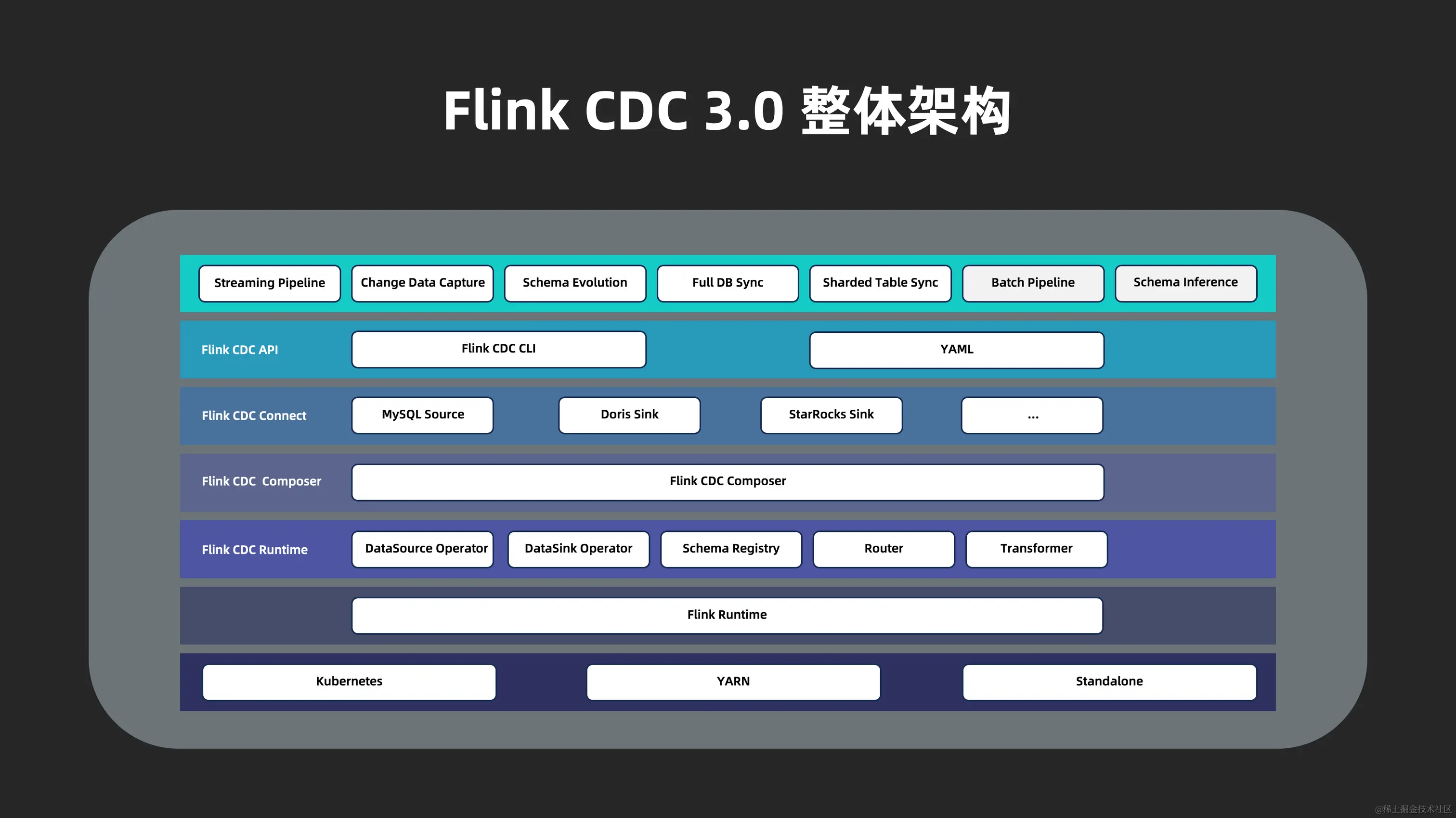 Flink CDC 3.0 的整体架构自顶而下分为 4 层: