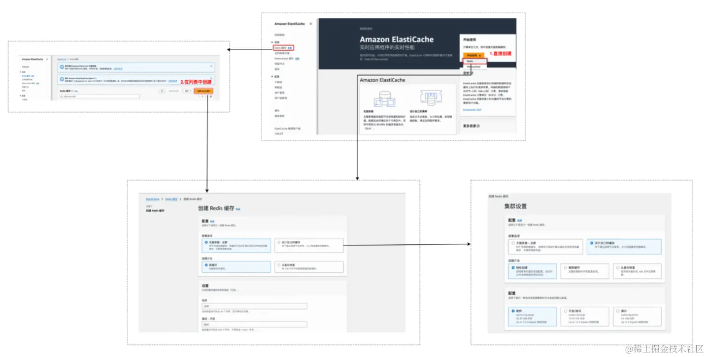 首先进入 elasticache 控制台创建一个 Redis 缓存。