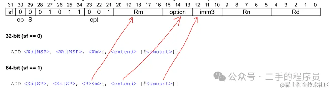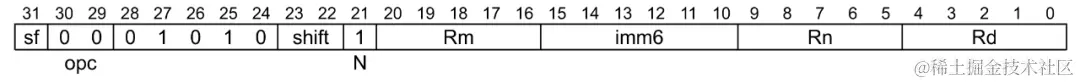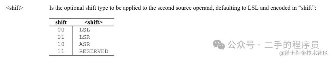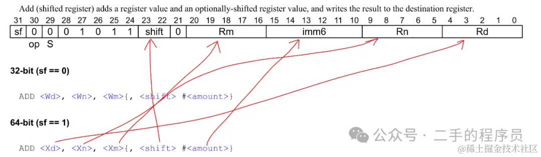 这个指令表示在相加前,需要将 X2 的值逻辑左移63 位。 imm6 是 6 位,刚刚好表示 0 ~ 63 的移位。