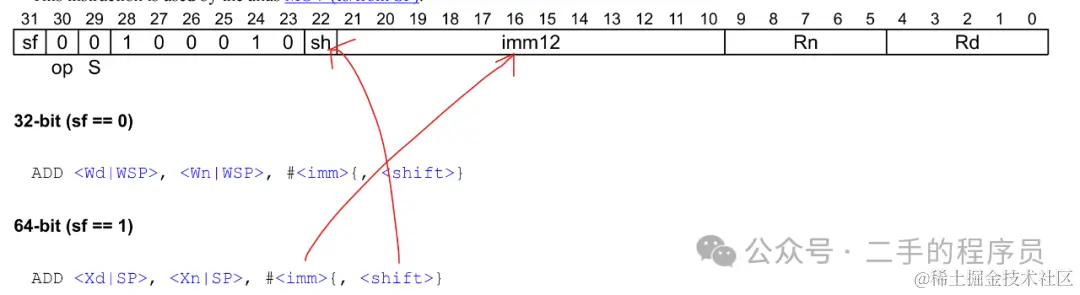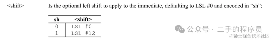 shift 是对 imm 进行移位,shift 为 0 的时候,表示左移 0 位,即不变。shift 为 1 的时候,表示左移12 位: