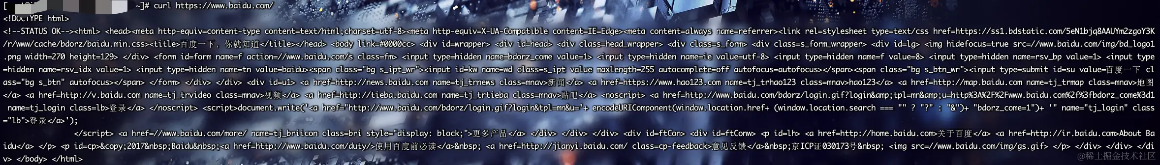 新开服务器标签,使用 curl 指令访问百度网址,获取数据