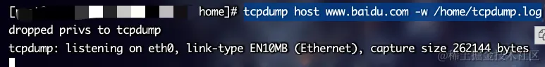 tcpdump host www.baidu.com -w /home/tcpdump.log
