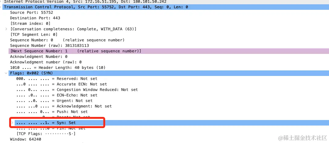 - 发送请求标志SYN = 1