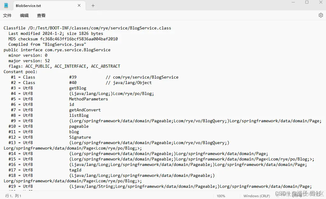 javap -v D:\Test\BOOT-INF\classes\com\rye\service\BlogService.class > D:\Test\BlobService.txt