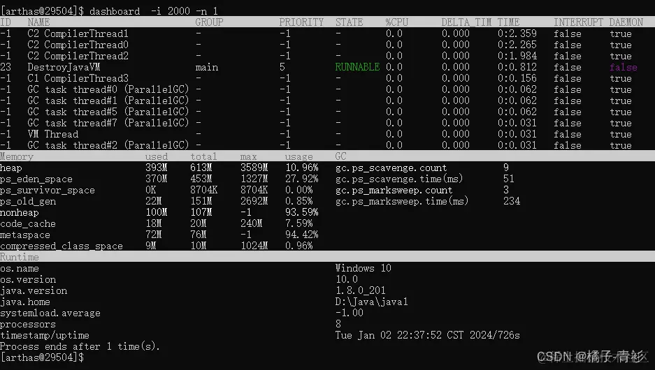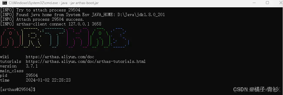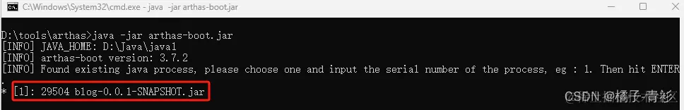 在arthas-boot.jar的目录下打开CMD输入命令启动Arthas: