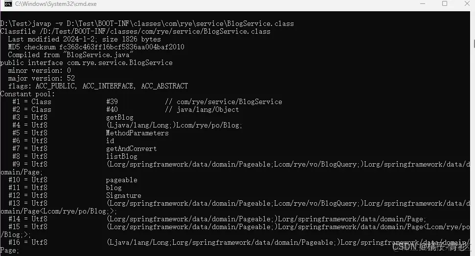 javap -v D:\Test\BOOT-INF\classes\com\rye\service\BlogService.class