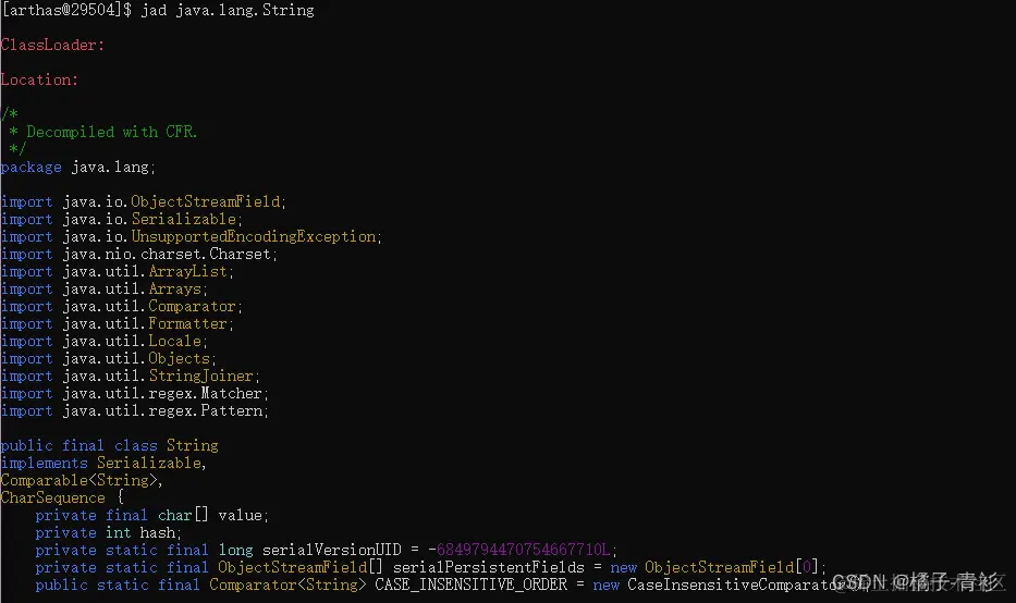 jad:反编译指定已加载类的源码。jad命令将 JVM 中实际运行的 class 的 byte code 反编译成 java 代码,便于理解业务逻辑(在 Arthas Console 上,反编译出来的源码是带语法高亮的,阅读更方便)。