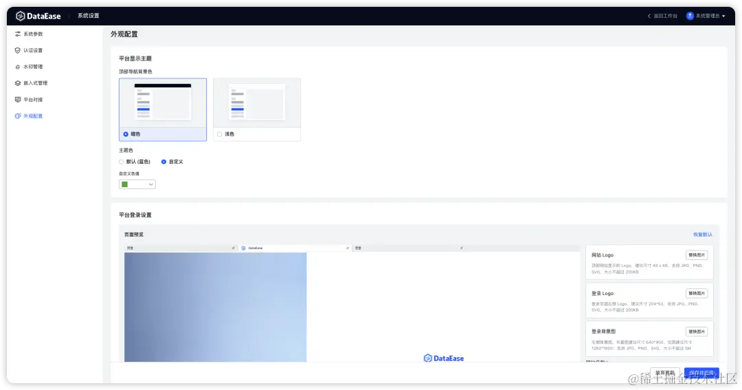 DataEase v2.4.0版本新增“外观配置”功能模块,用户可以根据自己的需要,自定义平台主题、Logo、Slogan、名称、背景图、导航、页脚等信息,进一步满足了用户操作界面定制化的相关需求。