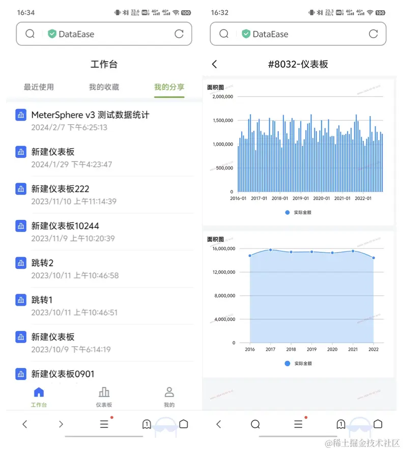 在v2.4.0版本中,DataEase新增了对移动端的支持。用户通过移动设备访问DataEase平台时,DataEase后端服务会判断访问设备的类型,自动跳转至访问设备对应的展示界面。在DataEase移动端中,用户可以方便地查看收藏的仪表板等可视化数据,随时随地掌握业务的动态变化。