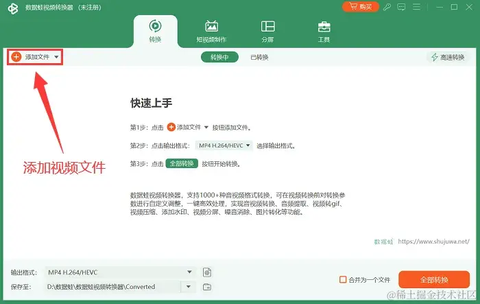 步骤1:在电脑安装最新版本的数据蛙视频转换器。点击 【添加文件】 按钮或拖放MP4视频文件到软件中。