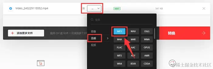 步骤2:选择完文件后,您会看到一个下拉菜单,在 【音频】 窗口中选择 【MP3】 作为输出格式。