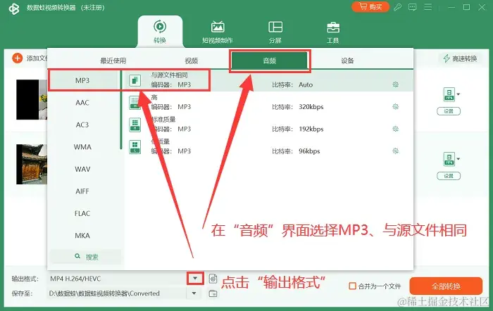 步骤2:在转换器界面下方,找到 【输出格式】 选项,选择 【MP3】 作为输出格式,设置 【与源文件相同】 作为文件输出参数。