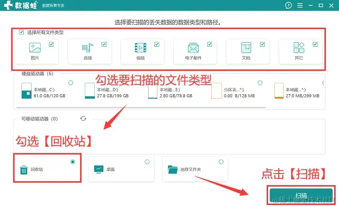 步骤2:在扫描界面,可以只勾选上需要扫描的文件类型,也可以将文件类型全选上,同时勾选上【回收站】 ,单击【扫描】 ;