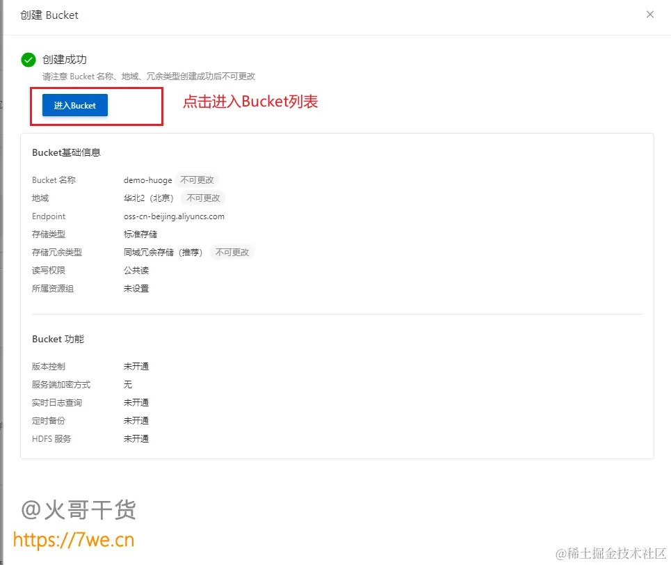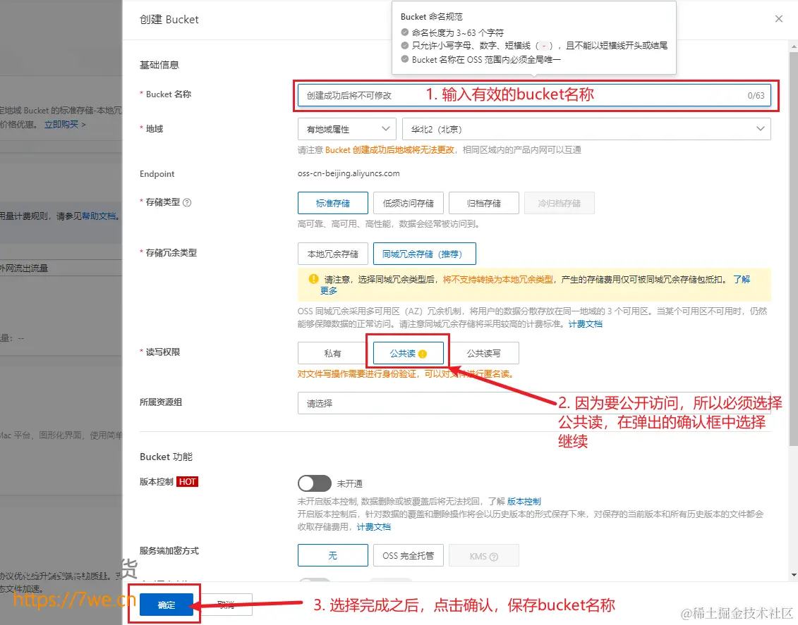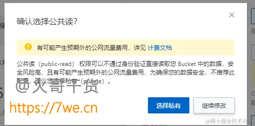 - 读写权限:一定要选择“公共读”,否则平台无法通过公网访问 Bucket 中的内容。