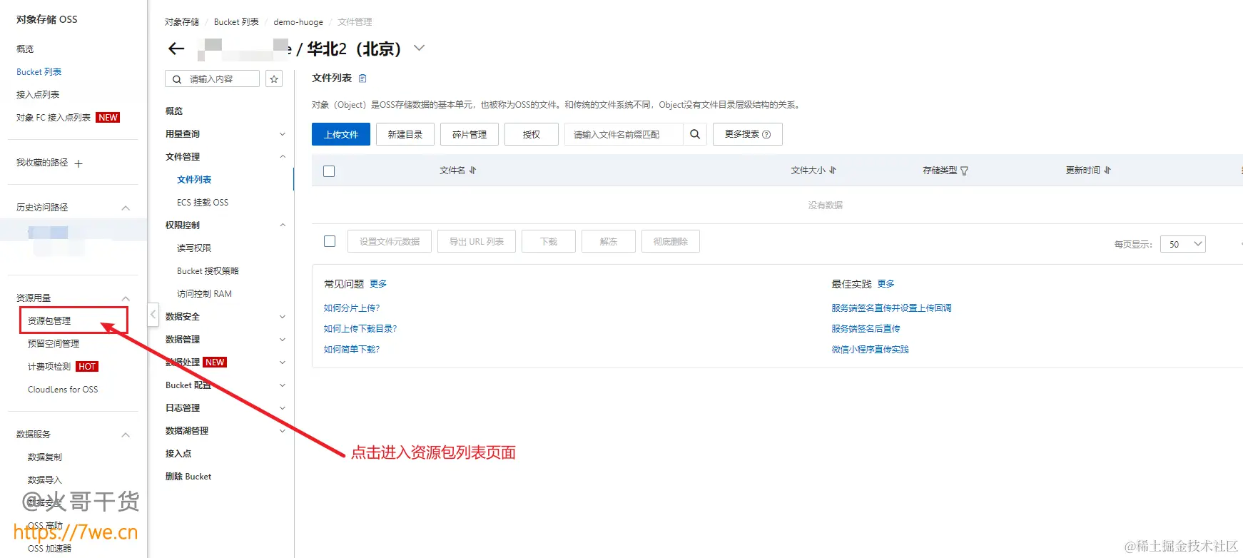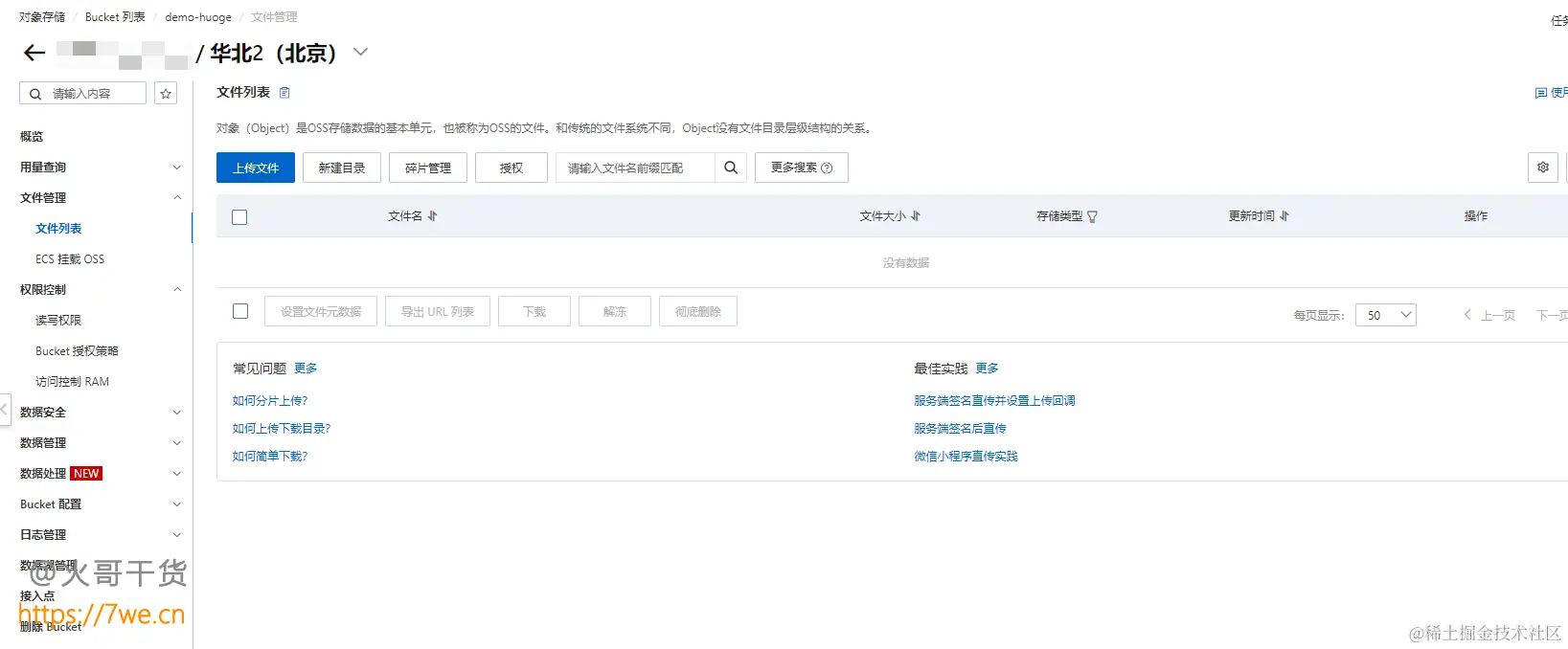 创建完成之后,在Bucket列表页面就可以看到刚刚创建的Bucket数据了,此时可以点击上传文件按钮测试是否可以正常上传文件。