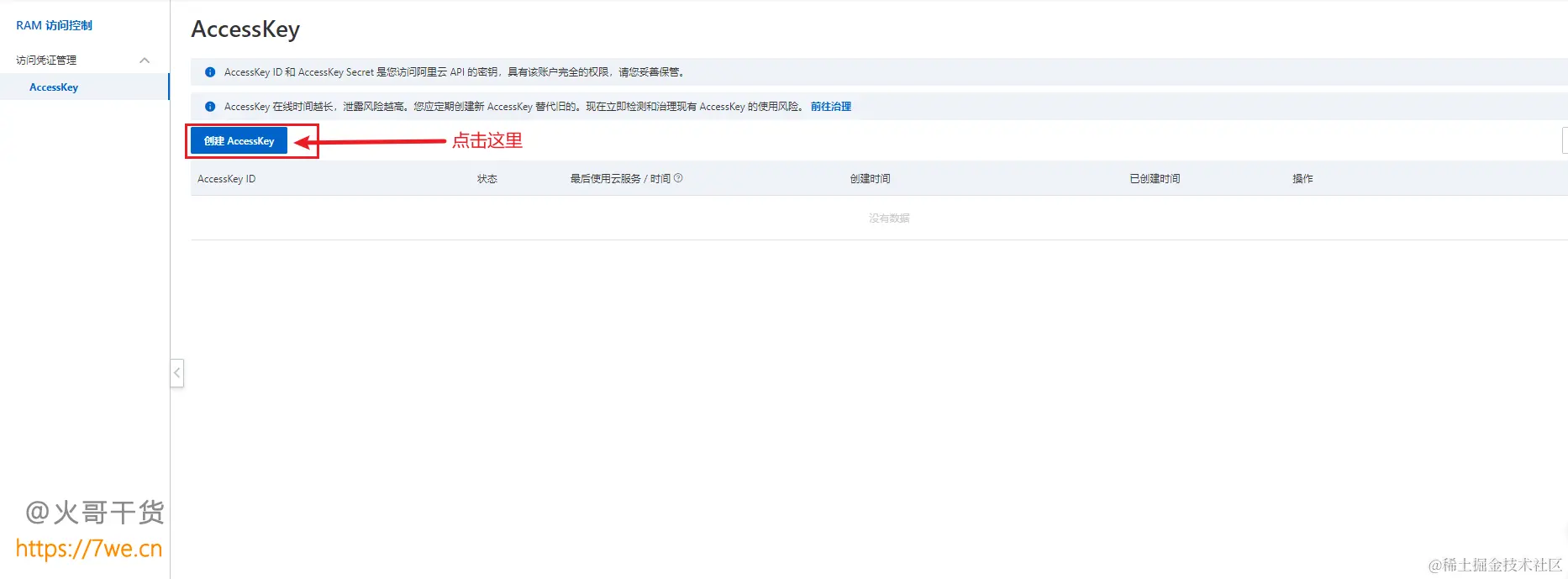 鼠标移动到主界面右上角的头像上,在弹出的页面中点击AccessKey管理,进入AccessKey管理界面。