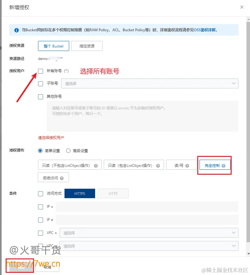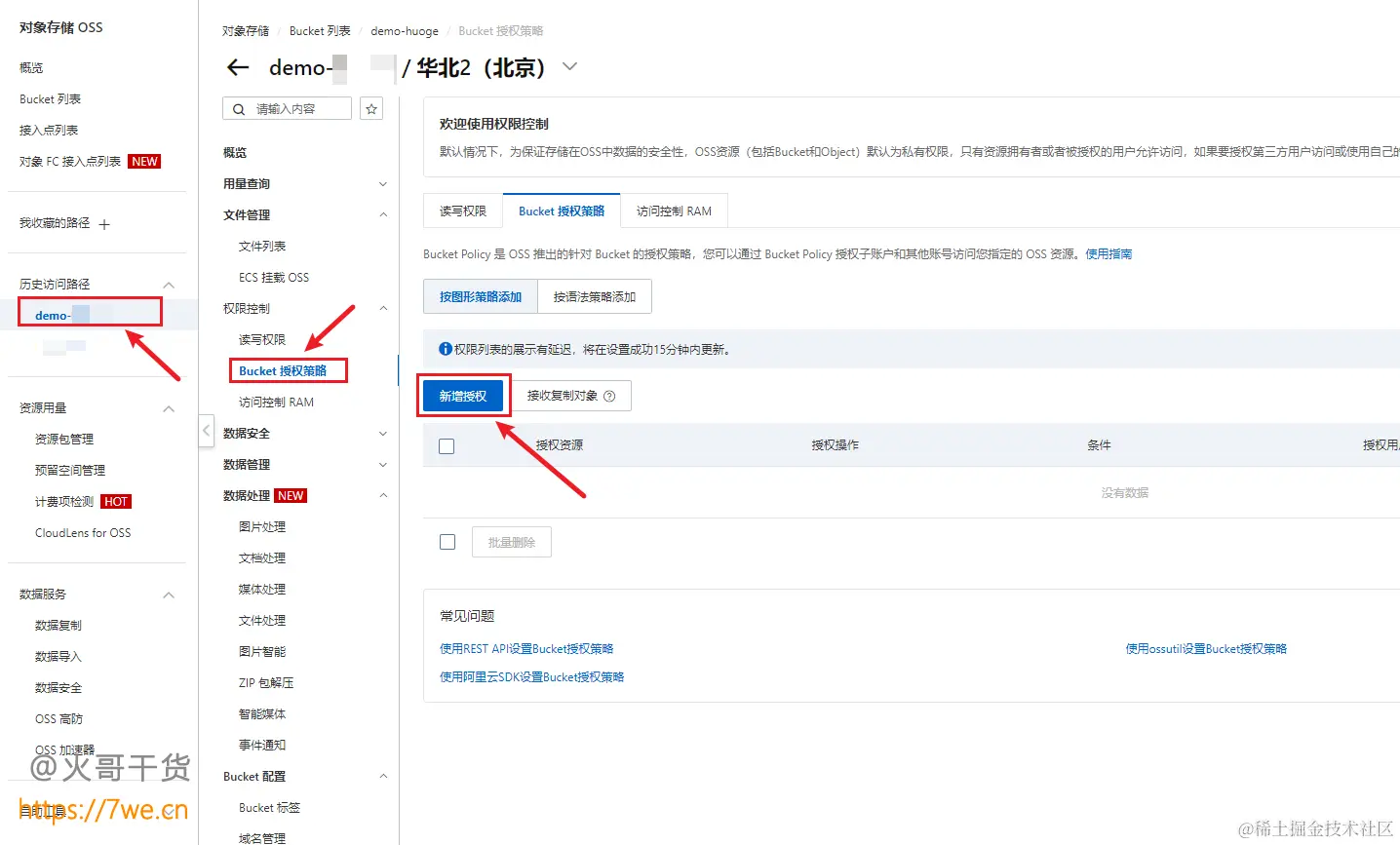 回到 Bucket 页面,找到“权限控制”面板,点击“Bucket 授权策略”,新增授权: