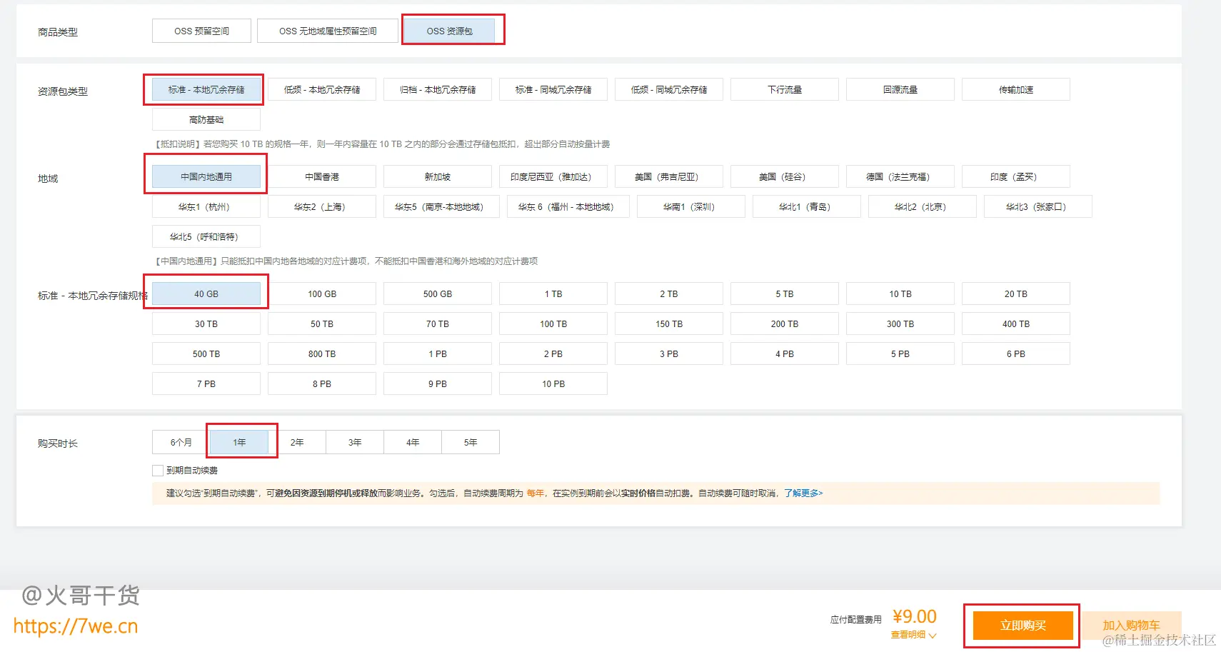 继续,在页面中选择图示中的规格参数,其中容量和时长需要根据你的具体情况来选择,选择好了之后点击立即购买按钮按提示支付即可。