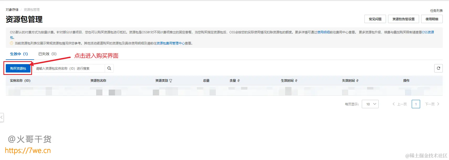 在点击左侧菜单中的资源包管理资源包列表页面,点击列表页面中的购买资源包按钮,进入购买界面。