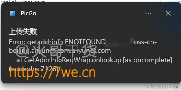 请注意,在配置阿里云OSS作为图床时,对于“存储区域”这一设置项,您只需要提供OSS的域名前缀即可,否则会导致图片上传失败,如下图: