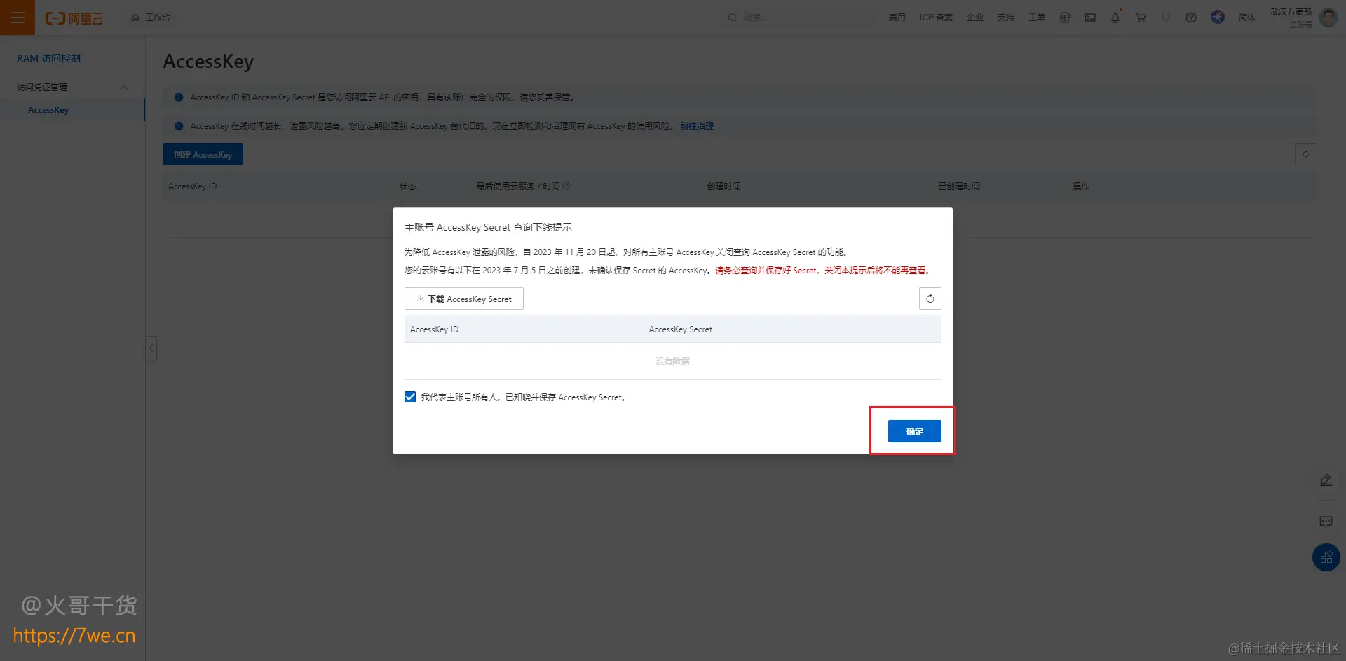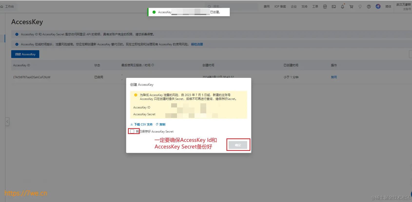 至此,AccessKey已成功创建。请务必妥善备份AccessKey数据,并确保其安全,避免泄露给未经授权的人员。AccessKey是访问阿里云服务的敏感凭证,一旦泄露,可能导致安全风险。因此,请务必谨慎处理并妥善保管。
