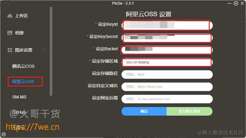 在PicGo的主界面中,请点击“阿里云OSS”的按钮。随后,在右侧的界面中,根据提示填写红框内的必要数据,包括您的AccessKey ID、AccessKey Secret、Bucket名称以及存储区域等。完成填写后,请点击“确定”按钮以保存设置。最后,为了确保每次上传图片时都使用阿里云OSS作为图床,请点击“设置默认图床”按钮,将阿里云OSS设置为PicGo的默认图床。这样,您就可以方便地使用PicGo将图片上传到阿里云OSS,并获取对应的图片链接了。