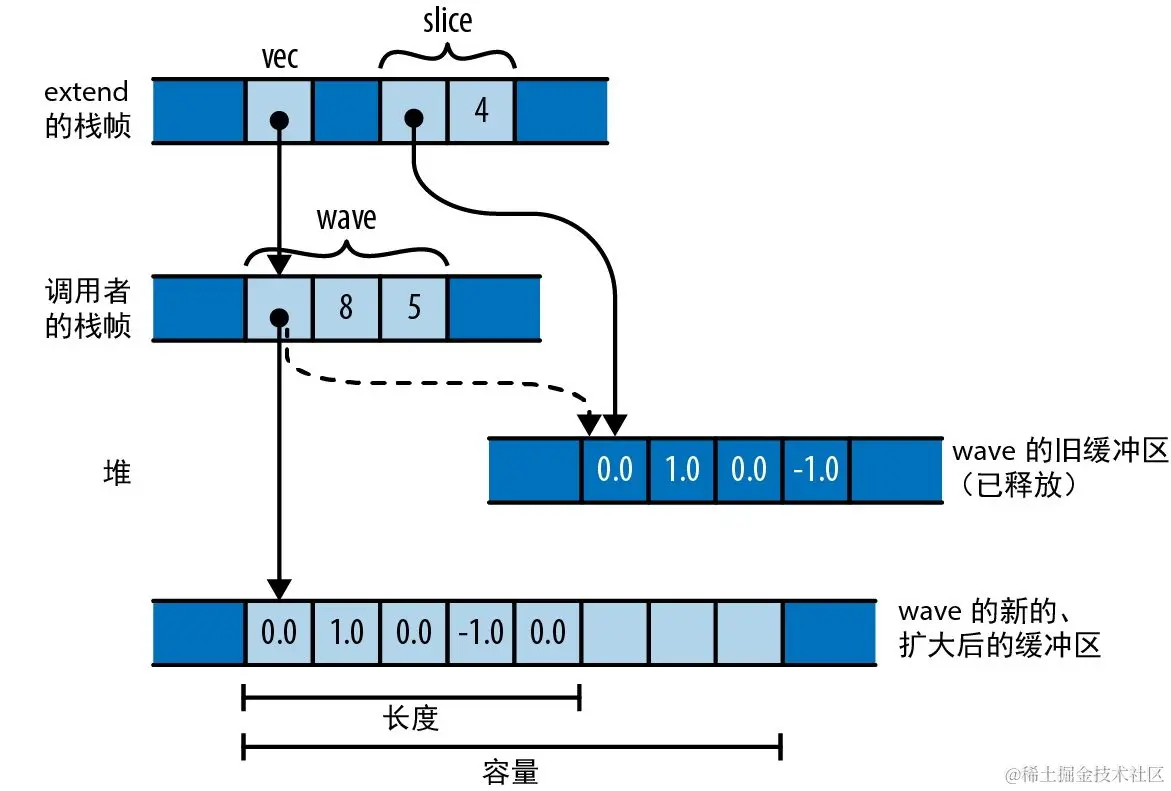 extend 函数的 vec 参数借用了 wave(由调用者拥有),而 wave 为自己分配了一个新的缓冲区,其中有 8 个元素的空间。但是 slice 仍然指向旧的 4 元素缓冲区,该缓冲区已经被丢弃了。