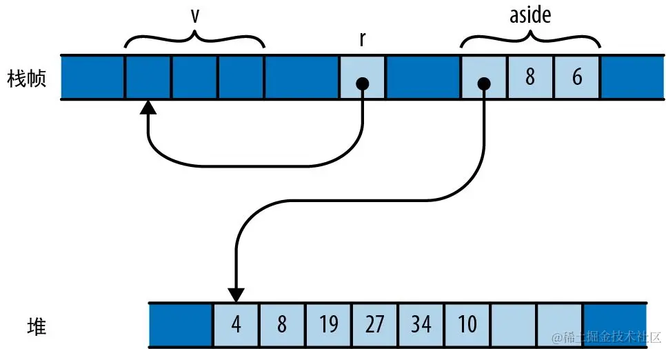 对 aside 的赋值会移动向量、让 v 回到未初始化状态,并将 r 变为悬空指针,如图 5-7 所示。