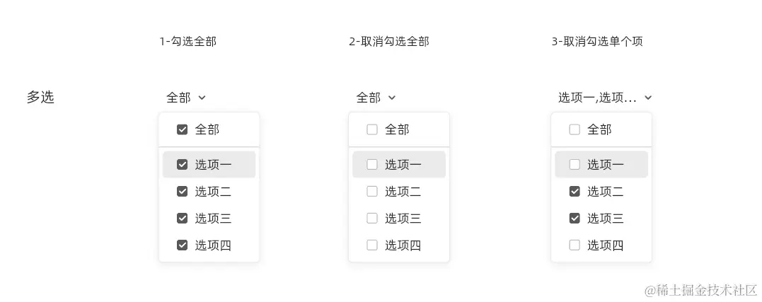 设计师在设计定义下拉菜单时,注意对一些交互细节做好规定,比如勾选全部时,下面所有选项也应被选中。