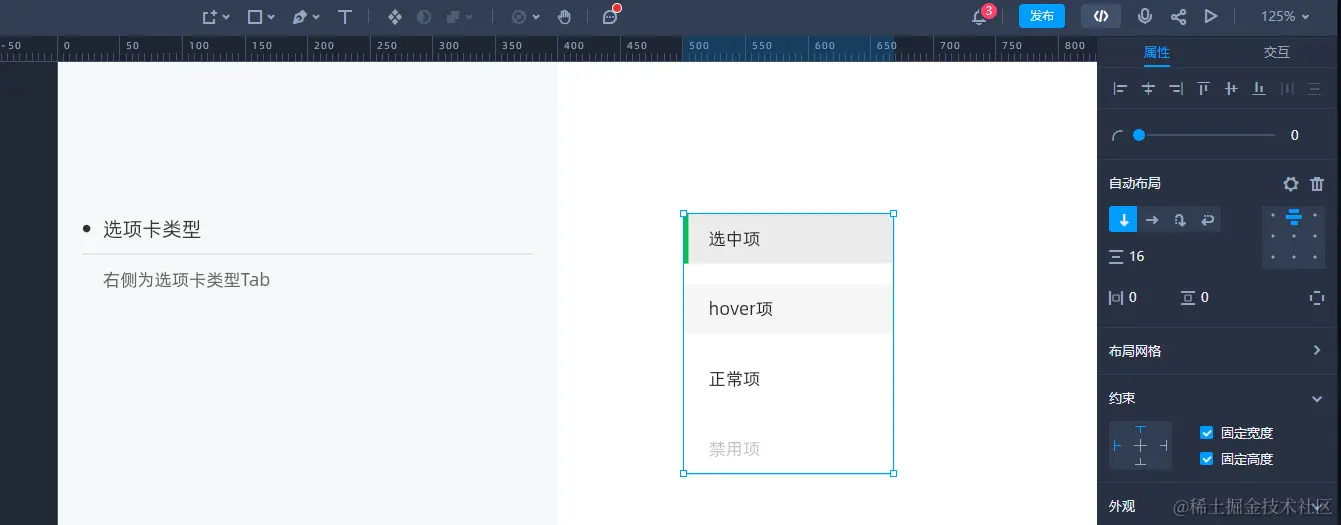 在设计这种选项卡类型时,使用摹客 DT 的自动布局功能,可以快速搭建组件,还便于后续修改调整。