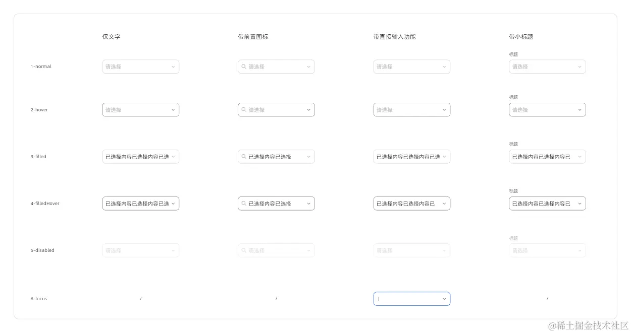 常见的选择器主要是框状下拉选择,设计师除了定义基础的间距、尺寸大小,特别容易遗漏一些关键状态,可以参考以下状态拆解。