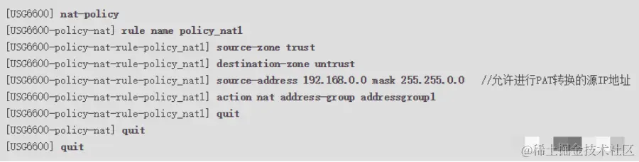 - 配置防火墙PAT转换功能,使用户可以访问外部网络。