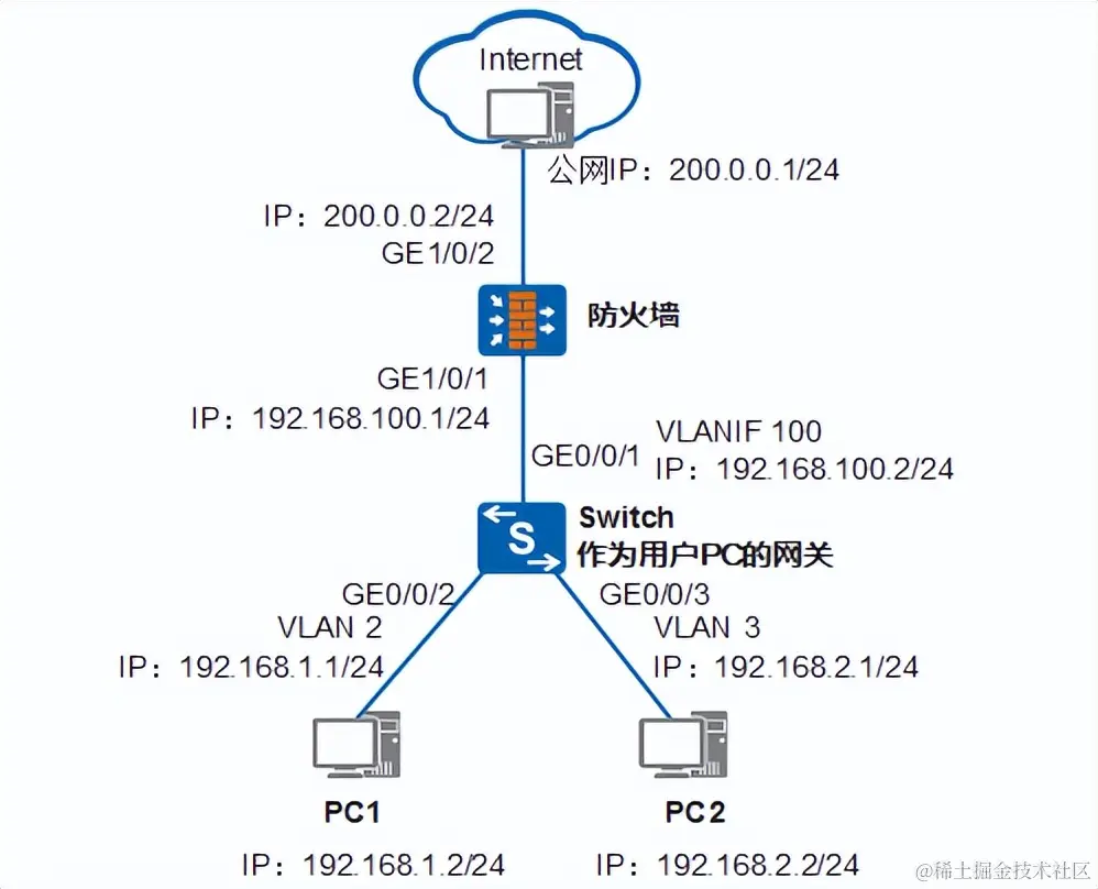 某公司拥有多个部门且位于不同网段,各部门均有访问Internet的需求。现要求用户通过三层交换机和防火墙访问外部网络,且要求三层交换机作为用户的网关,使pc1与pc2都能够访问外网。