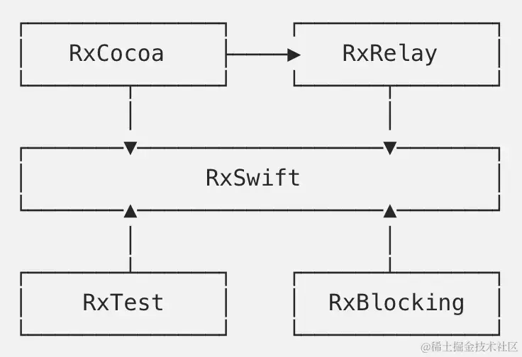 由于上述原因,我们将 Relays 移入了自己的框架 - RxRelay - 并调整了 RxSwift 的依赖关系图,如下所示:
