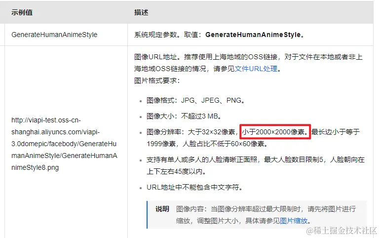 上文说到我们在调用人像动漫化接口之前先将人像图片做了增强,但是用户自己上传的图片可能像素会很大,会超过20002000,因为人像动漫化接口限制,图片大小不能超过20002000:
