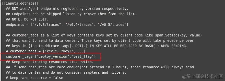 DDTrace 采集器用于采集链路信息,进入到 DataKit 安装目录下,执行 conf.d/ddtrace/ ,复制 ddtrace.conf.sample 并重命名为 ddtrace.conf ,在 ddtrace.conf 配置新增 customer_tags=["test_flag"] ,将对应的 Baggage 转化为 tag 。