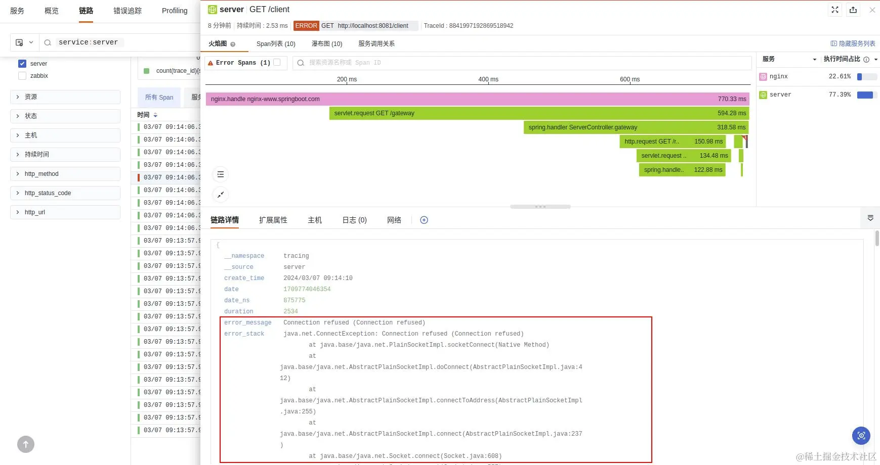 红色标记代表异常,说明当前链路处于异常状态。通过查看链路详情可以查看到堆栈信息,最终根据调整的代码进行再次发布,通过同样的方式进行再追踪、再验证。
