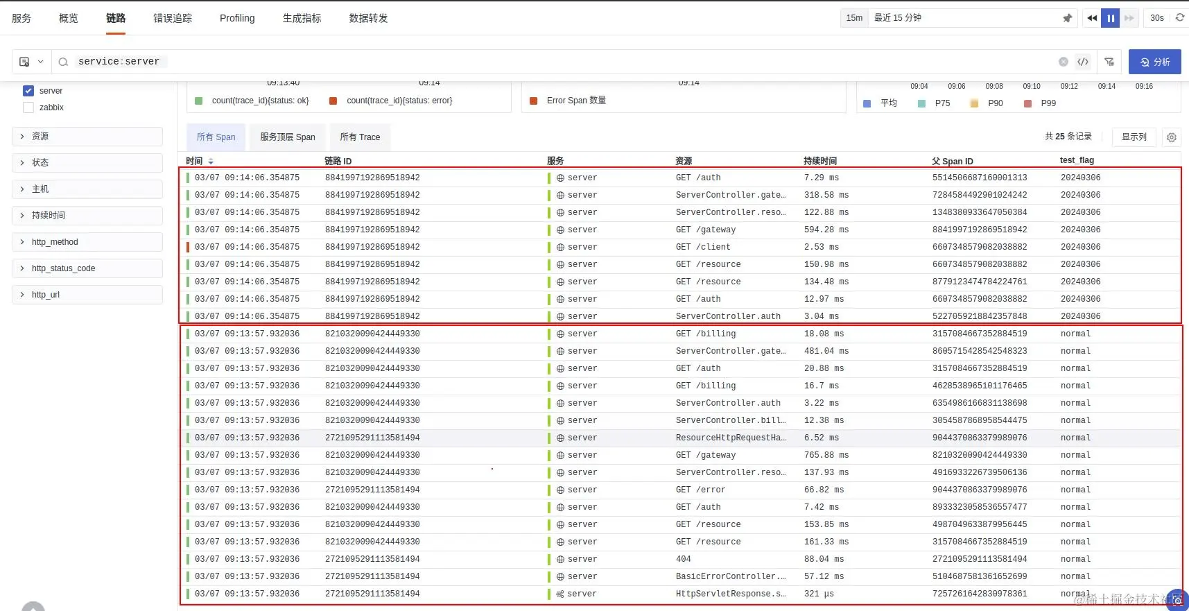从观测云上通过链路追踪,可以发现所有的 span 都有 tag 为 test_flag ,其中值为 20240306 的链路为本次新发布的接口。