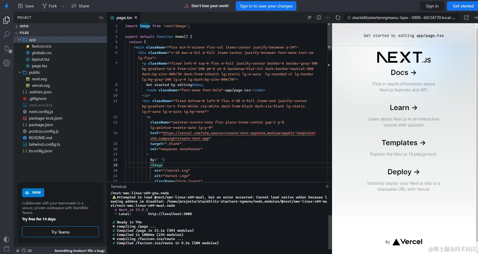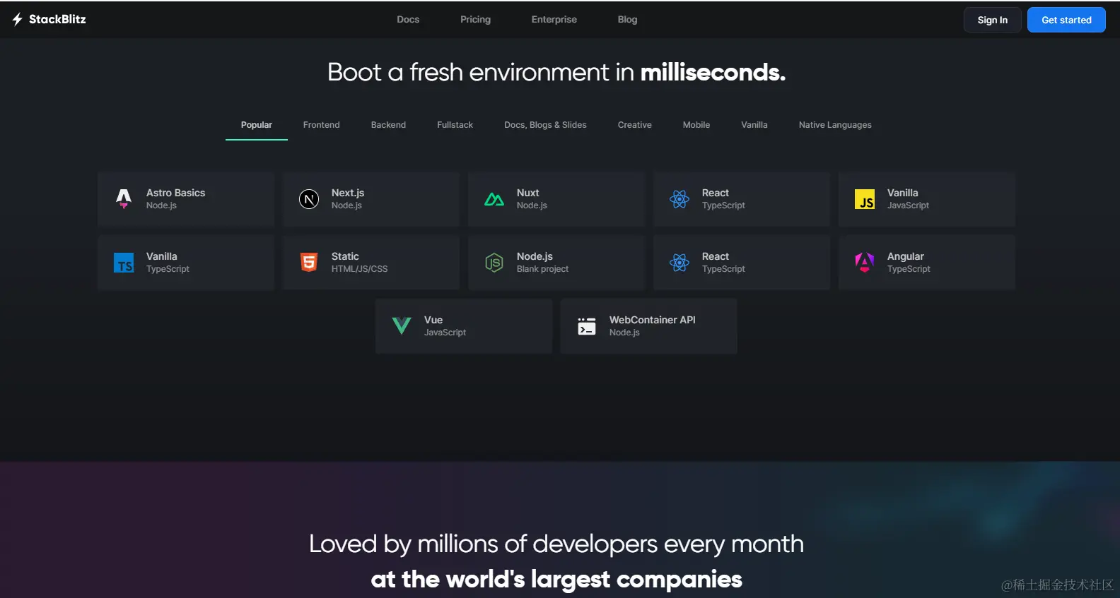 Stackblitz是一款在线IDE工具,可以直接在浏览器中直接运行Node并安装NPM依赖,甚至直接类似脚手架一样帮我们初始化版本项目。