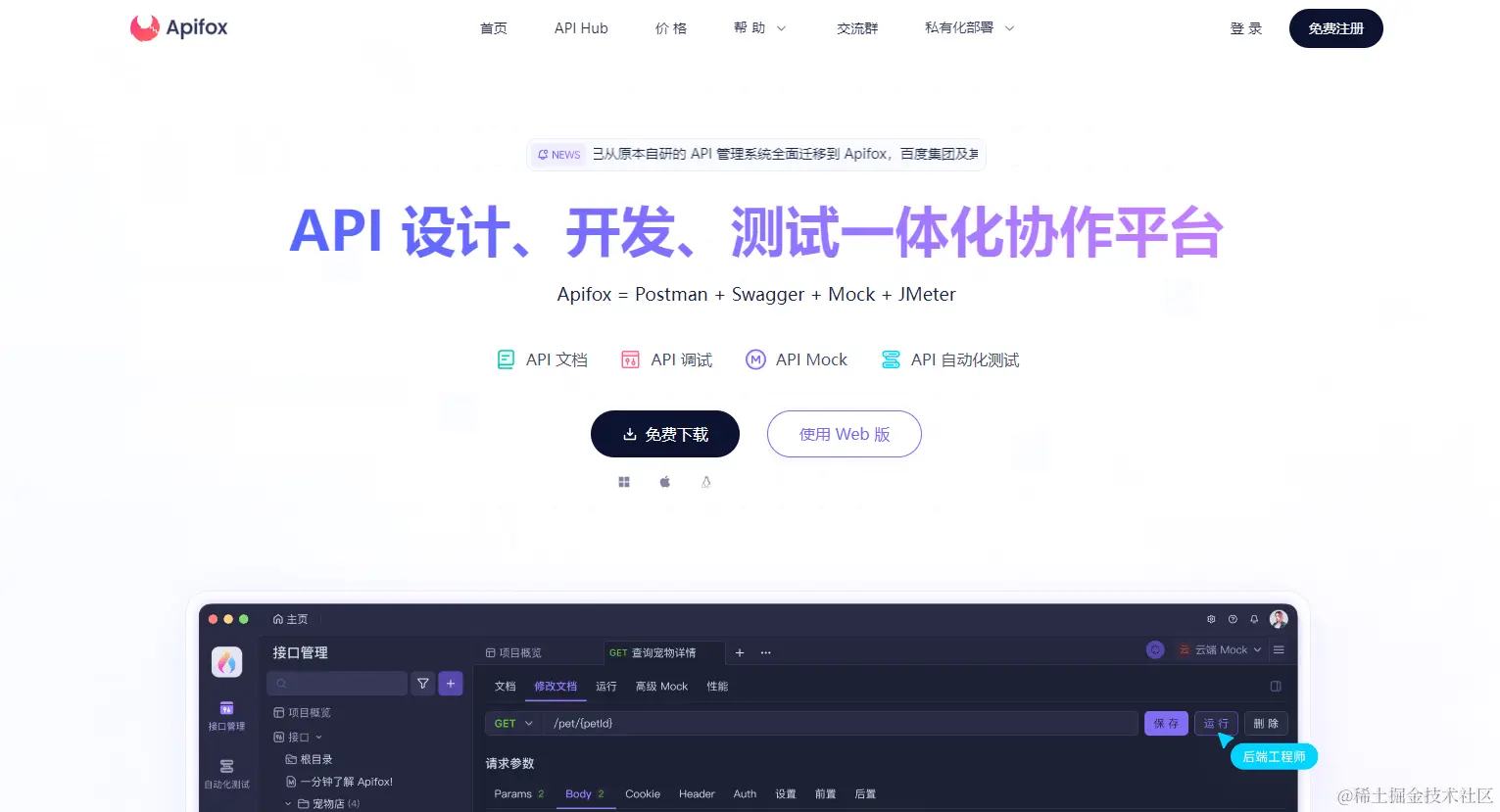 Apifox是一款接口管理神器,说起调试接口,大家肯定都知道Postman,但是Postman只能下载软件使用,没有在线工具。而Apifox不仅支持桌面端使用、同时也支持Web端,Apifox是国人做的产品,所以对用国内的开发人员来说更友好