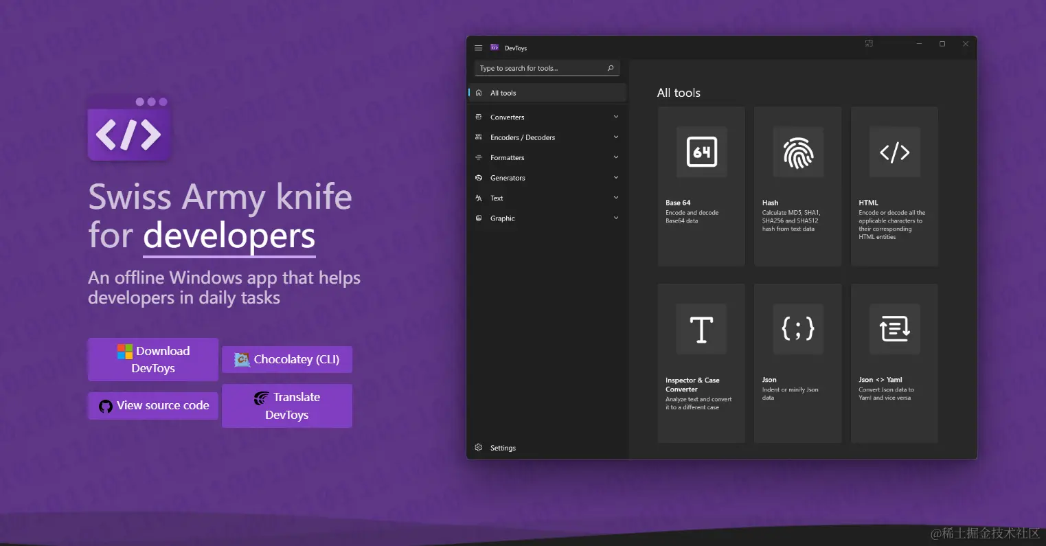 DevToys用于处理日常任务,支持14 种不同的工具,包括 Json 到 Yaml、Yaml 到 Json 转换、编码 / 解码、文本比较、图片转换等等。方便开发者处理关于数据方面的简单任务,无需打开其他工具。被誉为开发人员的瑞士军刀