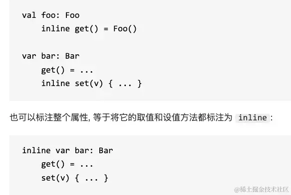 - 内联函数是将lambda表达式的函数体放到函数内,而不是原有函数的调用,同样kotlin提供了内联属性的概念:属性的取值和赋值函数体在调用的地方执行。
