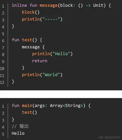 内联函数的机制,在接受的lambda表达式中(表达式的函数体在内联函数中直接执行)可以提供return语句,像常规函数一样退出lambda表达式并退出函数。