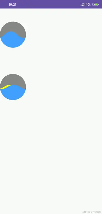 这个方法正好适合我们绘制波浪的场景啊。我们用圆形的path对画布进行剪切,后续绘制的图案也只有圆形范围内才会显示。我们用填充的方式绘制一个顶部为波浪的框形状,最后展现出来的效果便是,只有圆形区域可以显示波浪,外围会被切割掉。