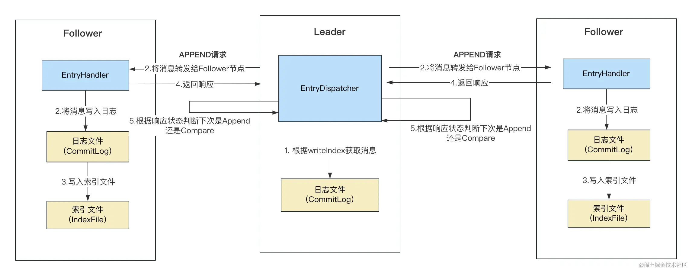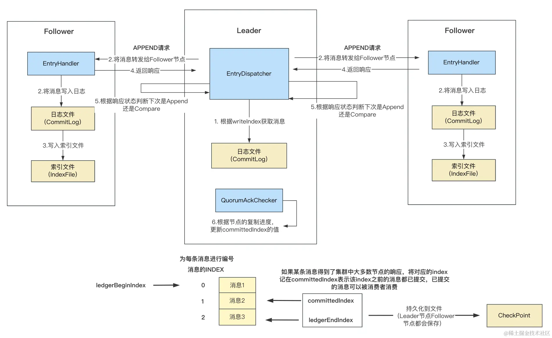 APPEND请求处理逻辑如下: (1)计算writeIndex的值,Follower的LedgerEndIndex记录了最后一条成功写入消息的index,对其 + 1表示下一条待写入消息的index,也就是writeIndex的值; (2)从请求中获取消息内容,将消息写入CommitLog文件; (3)上面说过Leader节点发送Append请求时,也会将记录的commitIndex设置到请求中,这里会从中取出commitIndex更新到Follower本地,后面讲QuorumAckChecker时候会提到;